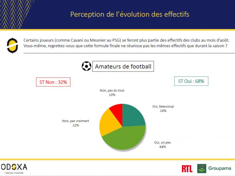 Les amateurs de football regrettent que les effectifs ne soient pas identiques à ceux de la saison en cours. 68% d’entre eux nous le disent. À leurs yeux, cela dénature sans doute un peu la compétition. Il aurait sans doute fallu créer des contrats d’exception, mais les amateurs de football auraient aimé que le "Final 8" réunisse les effectifs au complet.