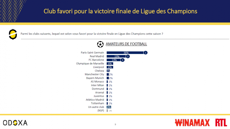 Le PSG, le Real Madrid, le FC Barcelone... et l'Olympique de Marseille : voici dans l'ordre les favoris à la victoire finale en Ligue des champions cette saison, d'après les amateurs de foot. Le tenant du titre parisien recueille 36% des sondages, le Real 19, le Barça 14 et l'OM 6 à égalité avec Liverpool. Suivent Chelsea (3%), Manchester City et le Bayern Munich (2%).