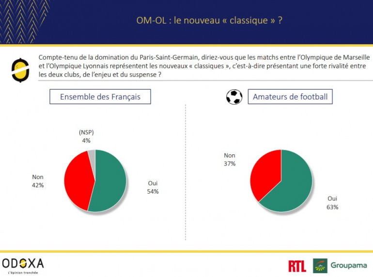 Marseille-Lyon plus fort que PSG-OM : pour 54% des Français et 63% des amateurs de football, les matches entre l'OM et l'OL sont les nouveaux "classiques" du championnat de Ligue 1.