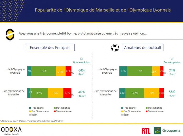 Toutefois l’écart se resserre en même temps que la popularité des deux clubs progresse. Depuis janvier 2017, l’OL a gagné 6 points et l’OM 10 points de bonnes opinions auprès des Français.