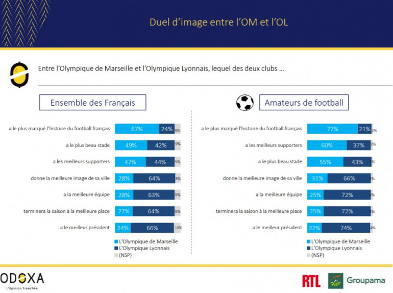 Les Françaises et les Français et les amateurs de football estiment aussi que le club phocéen est celui qui a le plus beau stade ainsi que les meilleurs supporters. L’OL remporte le match sur les quatre autres critères testés. Jean-Michel Aulas est considéré comme un meilleur président que Jacques-Henri Eyraud. L’OL a aussi la meilleure équipe et