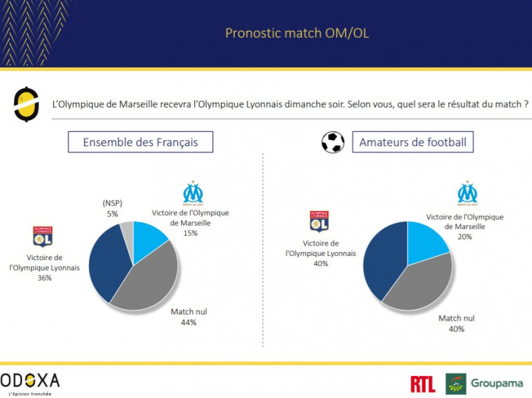 Même s’il aura lieu à Marseille, les Français voient l’OL favori de ce choc. Seuls 15% des Français et 20% des amateurs de football pronostiquent une victoire de l’OM. Ils sont 36% et 40% à anticiper une victoire lyonnaise. 44% des Français et 40% des amateurs pensent que les deux clubs se quitteront sur un match nul.