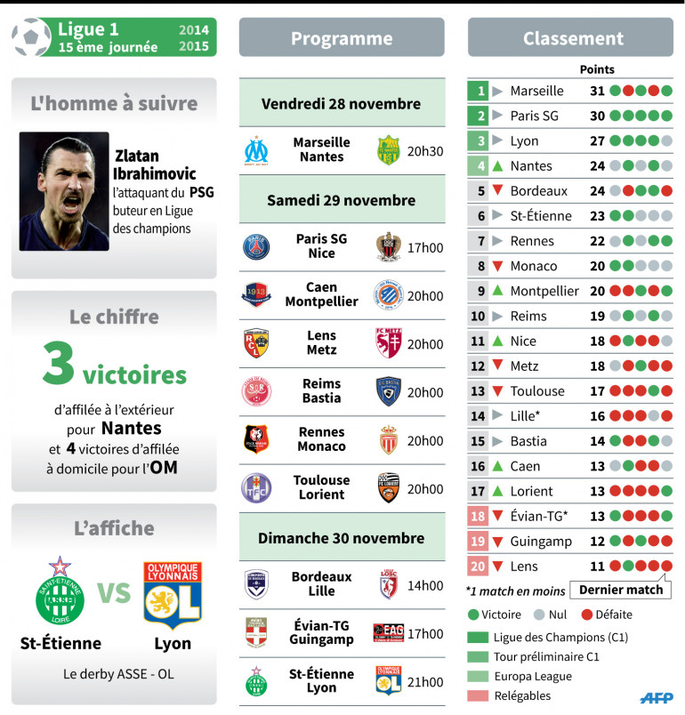 Au terme d'une semaine européenne qui a vu les clubs français gagner en Ligue des champions (Paris et Monaco) mais piétiner en Europa League (Guingamp, Lille et Saint-Étienne), la Ligue 1 revient sur le devant de la scène vendredi, samedi et dimanche, avec le 15e épisode d'une saison 2014-2015 toujours dominée par l'Olympique de Marseille de Marcelo Bielsa