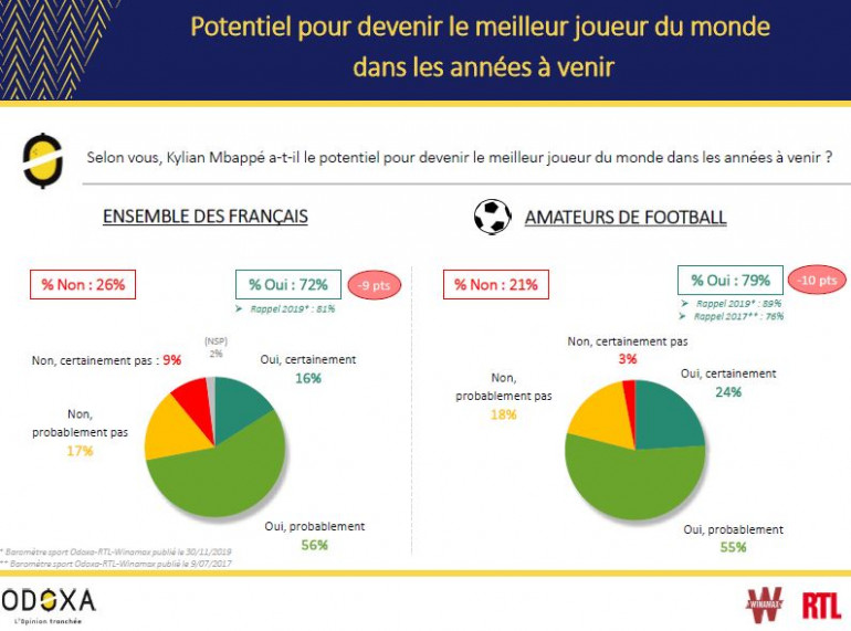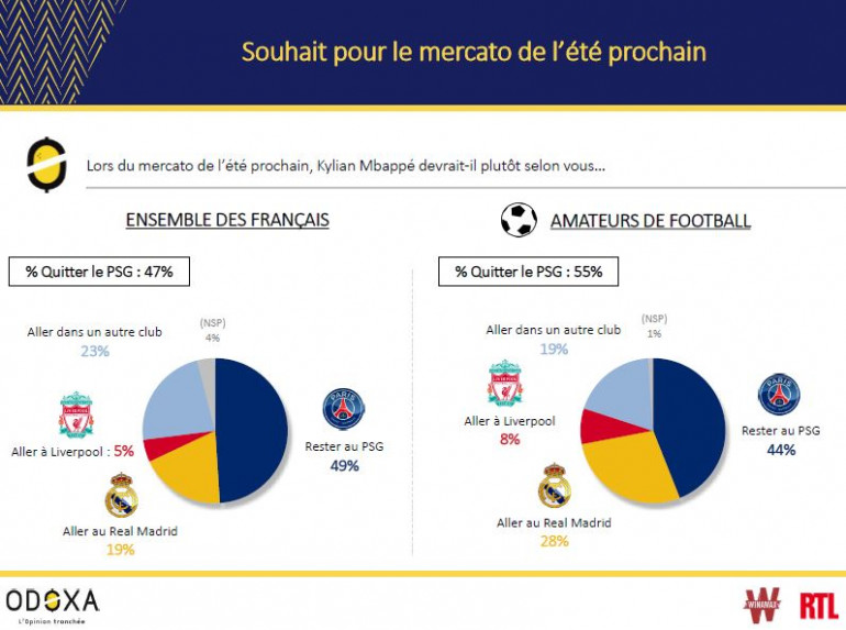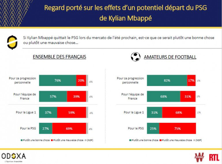 Idem pour la part du grand public qui estime que le joueur du PSG a le potentiel pour devenir le meilleur du monde : haute (72%) mais en baisse (de 9 points). Quant à son avenir, 49% des personnes interrogées estiment qu'il devrait rester à Paris contre 47% qui le voient rejoindre le Real Madrid (19%), Liverpool (5%) ou un autre club (23%).
