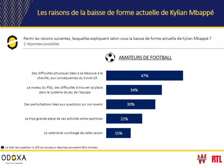 Pour les amateurs de football, la raison de la baisse de forme actuelle de Kylian Mbappé est à chercher du côté de son état physique. Pour près de la moitié d’entre eux (47%), sa mauvaise passe est due à des difficultés physiques liées à sa blessure à la cheville et aux conséquences de la Covid-19.