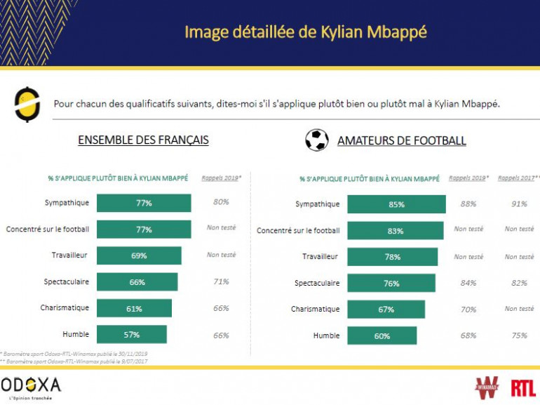 Signe d’attentes fortes à son égard dans ce domaine, Kylian Mbappé est un joueur spectaculaire pour 66% des Français mais il perd également des points sur ce critère (moins 5 pts) tout comme chez les amateurs de football (76%, moins 8 pts). Les Français sont également 61% à estimer que Kylian Mbappé est charismatique (moins 5 pts) tout comme 67% des amateurs de football (moins 3 pts).