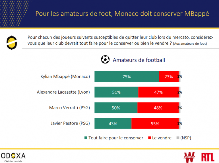 Selon 75% des amateurs de football interrogés, Monaco doit tout faire pour conserver son attaquant. Les résultats sont autrement moins unanimes pour les autres joueurs du panel. Alexandre Lacazette et Marco Verratti, joueurs de l'Olympique Lyonnais et du Paris Saint-Germain, peuvent être vendus pour respectivement 47 et 48% des sondés. Javier Pastore, autre milieu de terrain du PSG, est le seule joueur du panel dont la vente est majoritaire (55%).