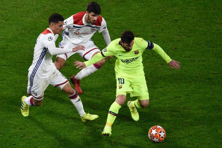Houssem Aouar et Martion Terrier à la lutte avec Lionel Messi le 19 février 2019