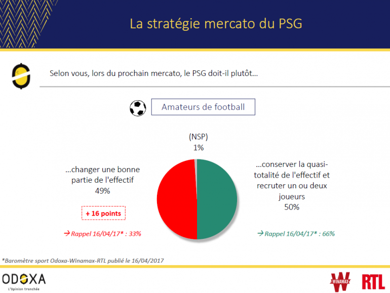 Le groupe de la capitale voudra très certainement se racheter dès la saison prochaine. Mais avec quel effectif ? Nasser Al Khelaïfi ne devrait pas rester inactif cet été. Les amateurs de football sont partagés quant à savoir si le président du PSG doit changer une bonne partie de son groupe ou non. 49% ont répondu par l'affirmative (soit 16 points de plus que depuis le 16 avril) et 50% ont répondu par la négative.