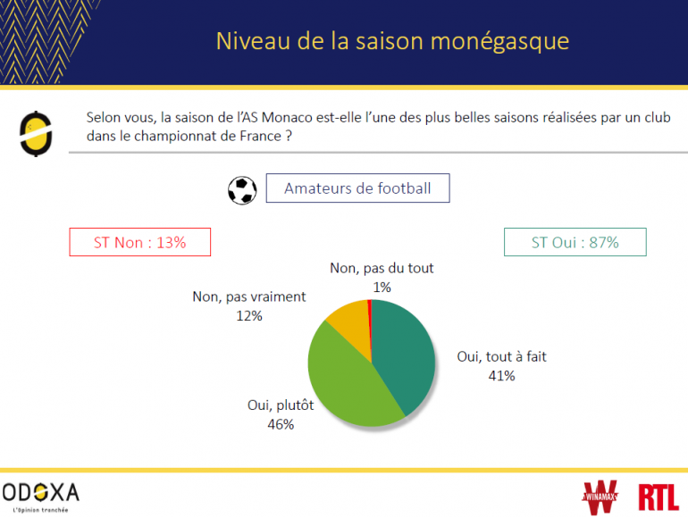 Un engagement offensif salué par les amateurs de football. Ils sont 87% à considérer le champion comme l'un des plus beaux de l'histoire du championnat. Parmi ce pourcentage, 41% ne laissent aucun doute et ont répondu "oui, tout à fait". Un seul petit pourcent affirme, en revanche, que Monaco n'est "pas du tout" le plus beau champion de France de L1.
