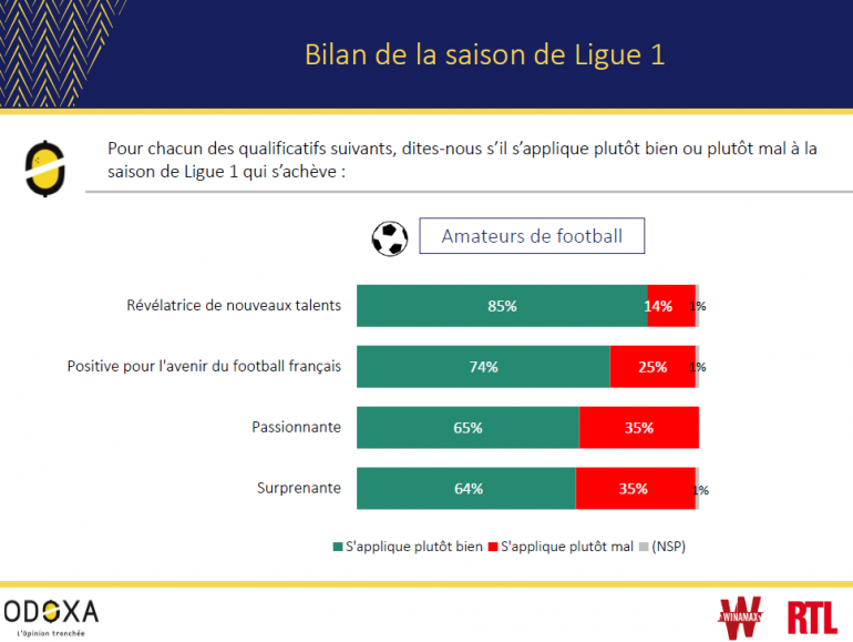 La saison qui s'achève a été "révélatrice de nouveaux talents", selon 85% des sondés. Kylian Mbappé, Presnel Kimpembé, Wylan Cyprien... Ils sont en effet nombreux à avoir explosé depuis août dernier. Selon trois amateurs de football sur quatre, cette saison a été "positive pour l'avenir du football français".