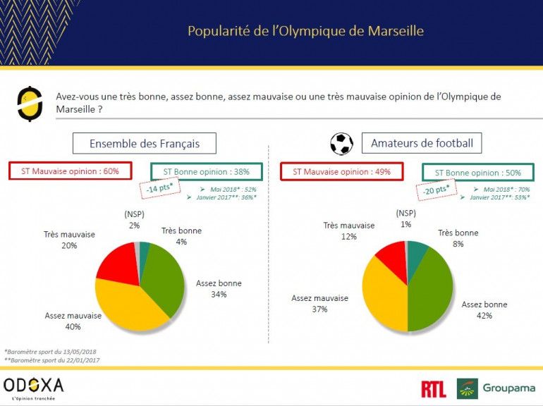 Chez les amateurs de football, le club phocéen est apprécié de 50% d’entre eux. Mais là encore, la baisse est de 20 points par rapport à mai dernier.