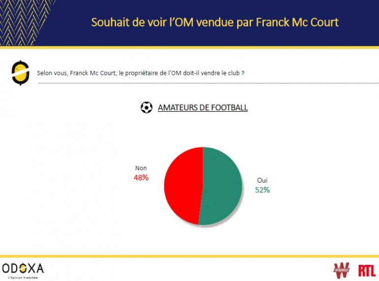 Les rumeurs de revente du club se sont intensifiées ces derniers mois. Lors de sa venue à Marseille, Franck Mc Court les a pourtant balayées d’un revers de main, espérant même que l’OM "reste dans sa famille pour des générations". Les amateurs de football ne le voient pas du même œil :: 52% estiment que l'homme de Boston doit se séparer du club.