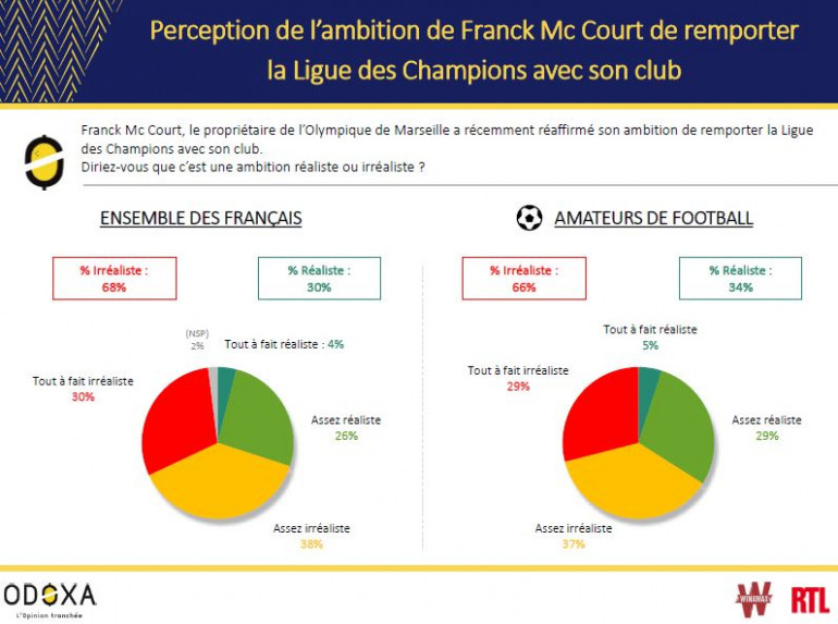 L'OM vainqueur de la Ligue des champions dans les années à venir ? Pour plus des deux tiers des Françaises et des Français (68%), l'ambition réaffirmée début mars par son propriétaire américain Frank McCourt est "irréaliste". En conséquence, 52% des sondés pensent que l'homme d'affaires de 67 ans doit revendre le club phocéen.