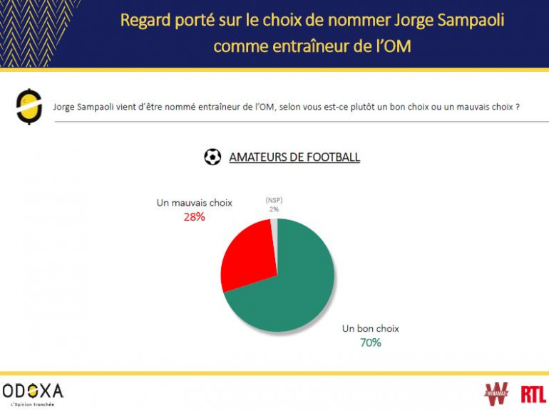 L'arrivée comme entraîneur de l'Argentin Jorge Sampaoli est en revanche bien perçue par les amateurs de football : 70% d'entre eux estiment que c'est un bon choix. Enfin, concernant la stratégie à adopter lors du prochain mercato estival, 69% pensent que Marseille doit vendre ses joueurs les mieux payés et recruter des jeunes joueurs à fort potentiel.