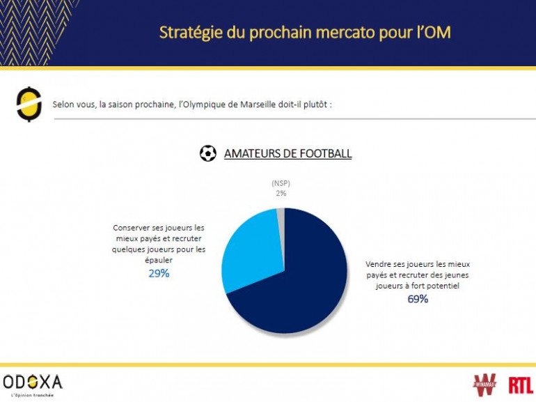 Plutôt que de persévérer à construire sur la base existante, les amateurs de football conseilleraient à l’OM un nouveau départ. 69% d’entre eux estiment que l’OM doit vendre ses joueurs les mieux payés et recruter des jeunes joueurs à fort potentiel. Ils ne sont que