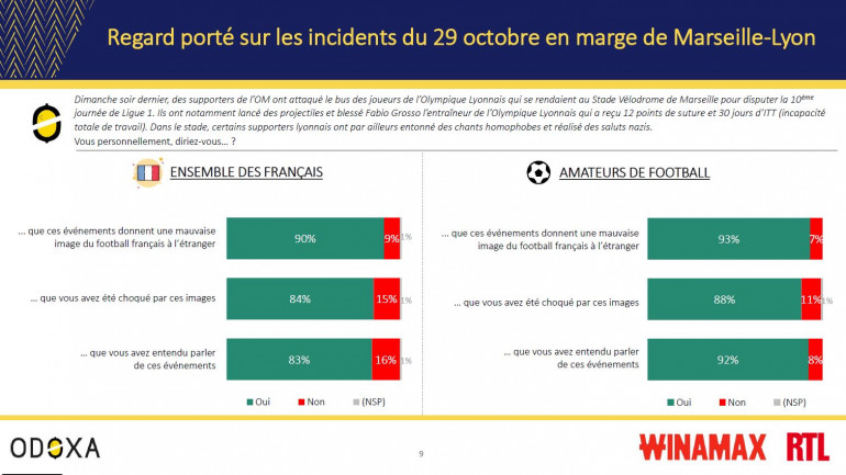 Ces événements en amont de ce choc des Olympiques ont par ailleurs eu un retentissement national extrêmement important : 83% des Français en ont entendu parler, 84% ont été choqués par ces images et 90% jugent que cela nuit à l’image du football français à l’étranger. Dans ce contexte, 93% des Français sont favorables à durcir les sanctions des comportements délictueux et recourir à la prison ferme pour les actes les plus graves, 90% à des interdictions de stades à vie. Ils sont moins nombreux à soutenir des sanctions sportives contre les clubs (61%).