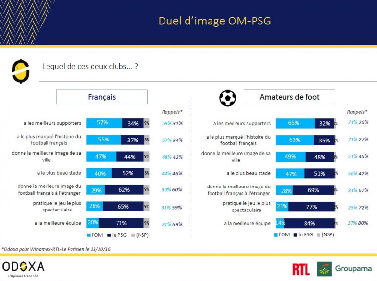 Voici les principaux enseignements du sondage réalisé par Odoxa pour RTL et Groupama sur internet les mercredi 24 et jeudi 25 octobre, auprès d'un échantillon de 993 personnes représentatives de la population française âgées de 18 ans et plus, parmi lesquelles 468 amateurs de football, selon la méthode des quotas. L'OM n'a plus battu le PSG depuis le 27 novembre 2011 (14 défaites et 3 nuls depuis).