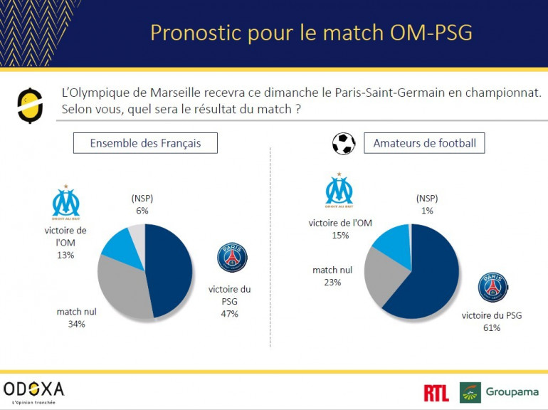 4e à 11 points des Parisiens de Thomas Tuchel, les Marseillais de Rudi Garcia l'emporteront pour seulement 13% des sondés. 47% voient une victoire parisienne et 34% un match nul.