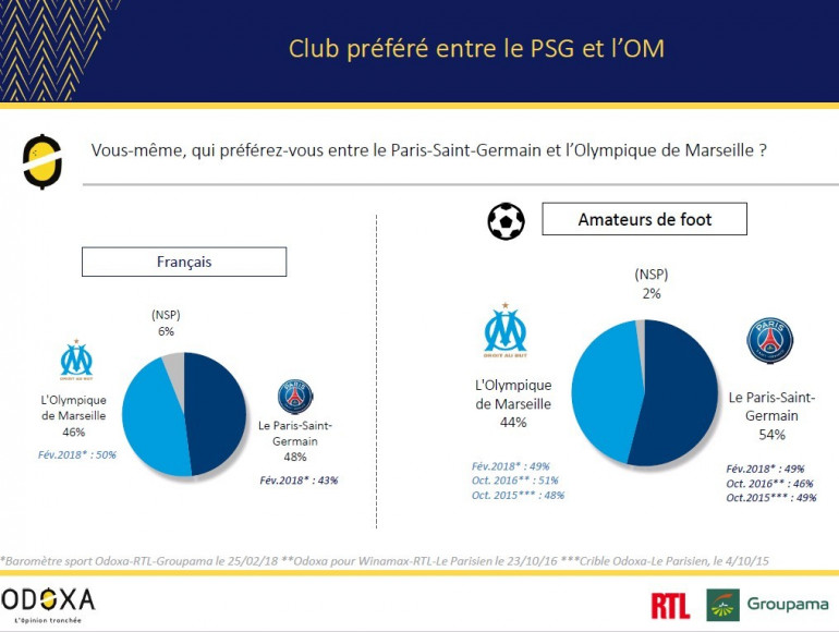 Chez les passionnés de ballon rond, l'écart est encore plus fort en faveur du club de la capitale : 54% contre 44%. Il y a deux ans, en octobre 2016, le club phocéen "s'imposait" 51 à 46.
