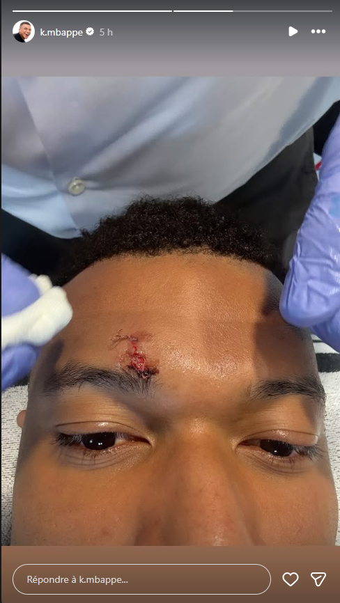 Selon le quotidien sportif espagnol AS, il a dû recevoir trois points de suture, et a donc été absent de l'entraînement ce dimanche. Sur son compte Instagram, Kylian Mbappé partage une photo montrant en gros plan la blessure au-dessus de son sourcil droit.