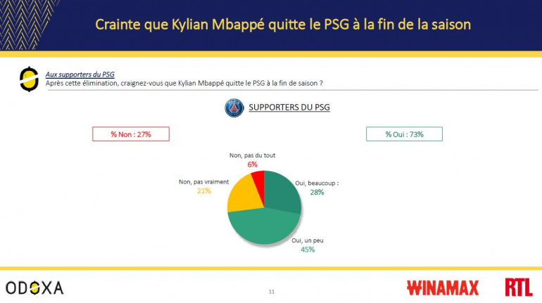 Après la nouvelle élimination dès les 8es de finale de la Ligue des champions face au Bayern, la consternation est le sentiment qui domine chez les supporters du PSG (36%) devant l’incompréhension (33%), le désespoir (20%) et la colère (11%). 90% estiment que le club de Munich était plus fort et 58% pointent les joueurs comme principaux responsables de l’élimination devant la direction (26%) et Christophe Galtier (14%).