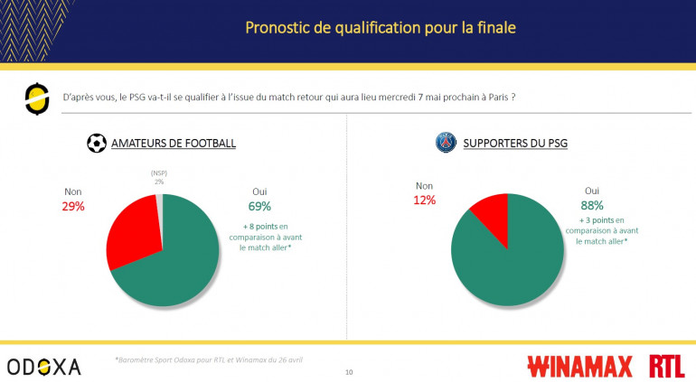 Ce succès à l’extérieur partage néanmoins : 50% des amateurs estiment qu’il est avant tout dû au fait qu’Arsenal n’a pas converti ses occasions de but contre 48% qui l’attribuent en priorité à la supériorité parisienne. En revanche, l’optimisme est au plus haut en vue du match retour de mercredi 7 mai (21h) : 69% des amateurs de foot pensent que le PSG se qualifiera pour la finale (+8 points en une semaine) et 62% qu’il remportera la Ligue des champions 2025.