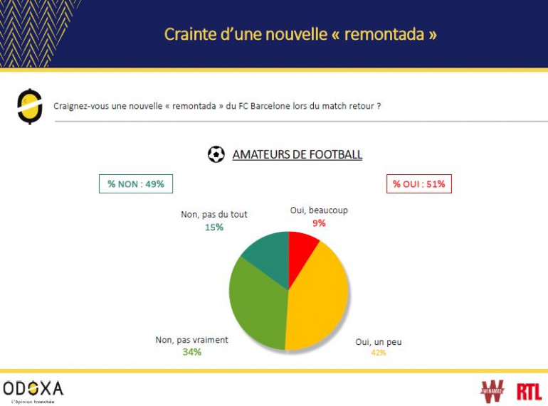 Plus récemment, en 2019, le come-back de Manchester, défait 2-0 à l’aller et vainqueur 3-1 au Parc a une nouvelle fois échaudé les supporters. Ces traumatismes sont encore présents chez de nombreux amateurs de football. Prudents, 51% d’entre eux nous confient craindre une nouvelle "remontada". 9% la craignent même beaucoup