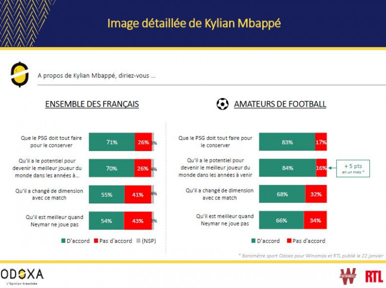 Auteur d’un triplé, Kylian Mbappé a été l’homme de ce match historique pour le PSG. Sa performance a été telle que 55% des Français et 68% des amateurs de football estiment qu’il a "changé de dimension" avec ce match. Ils en viennent même à douter de l’autre star du PSG : Neymar, blessé pour cette confrontation face à son ancien club. Pour 54% et 66% d’entre eux, l’attaquant français est meilleur quand le Brésilien n’est pas sur le terrain.