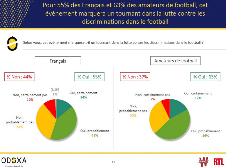 55% d’entre eux considèrent que cet événement marquera un tournant dans la lutte contre les discriminations dans le football. Les moins de 35 ans (60%) et les amateurs de football (63%) en sont encore plus convaincus.