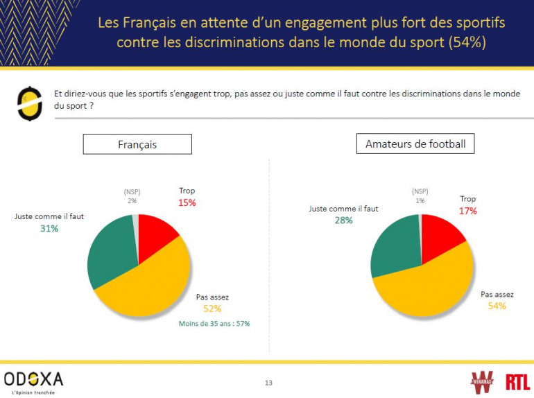 52% des Français jugent que les sportifs ne s’engagent pas assez contre les discriminations dans le monde du sport, 31% qu’ils s‘engagent suffisamment uniquement et 15% qu’ils s’engagent trop. L’attente d’une plus forte implication des sportifs est donc majoritaire dans la population.