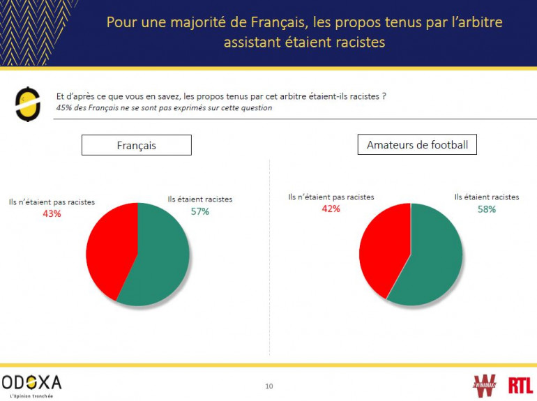 Le pourcentage de Français qui estiment que les propos de l'arbitre assistant Sebastian Coltescu à l'encontre de l'entraîneur adjoint du Basaksehir Pierre Achille Webo étaient "racistes" est inférieur de 16 points mais reste majoritaire. 57% des personnes interrogées vont dans ce sens.