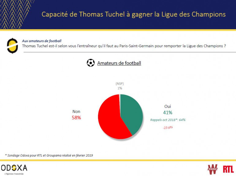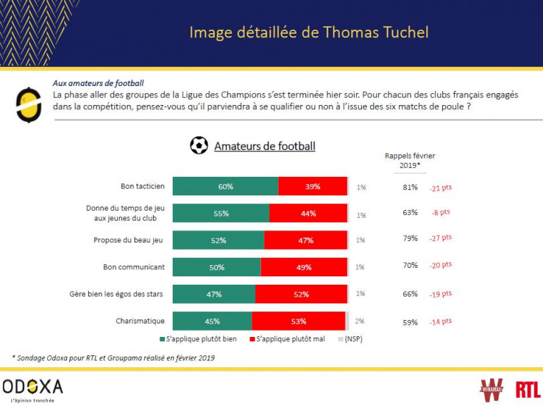 Thomas Tuchel est-il un bon tacticien ? 60% des amateurs de football répondent positivement, soit une chute de 21 points par rapport à février 2019 (81%). Un bon communicant ? Encore une baisse de 20 points ? L'entraîneur qu'il faut au PSG pour gagner la Ligue des champions ? Non, pour 58% des sondés.