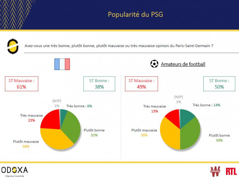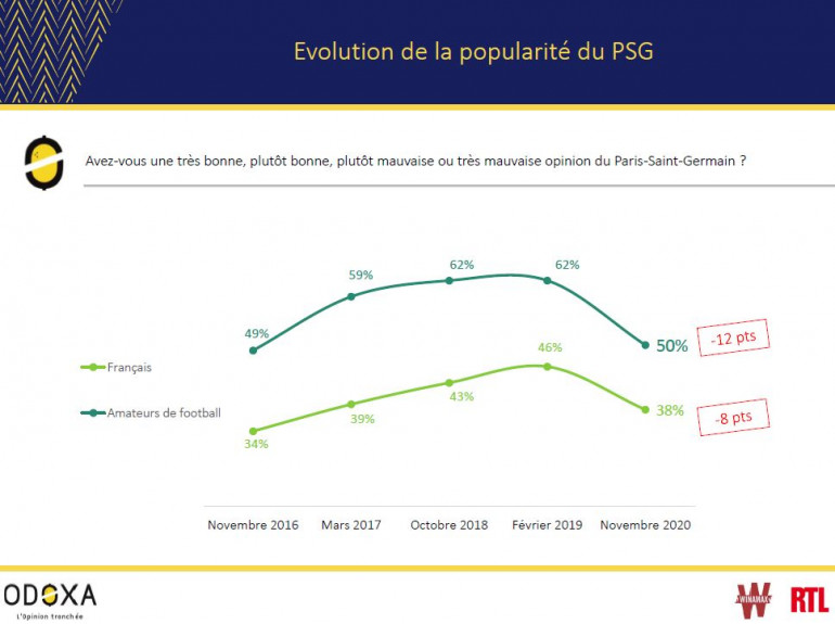 Depuis, le Paris Saint-Germain a ajouté deux titres de champion de France à son palmarès et a surtout joué une finale de Ligue des champions, des résultats qui auraient pu faire encore progresser sa popularité. C’est pourtant tout le contraire qui s’est produit. Seuls 38% des Français et 50% des amateurs de football ont aujourd’hui une bonne opinion du club, soit respectivement 8 et 12 points de moins.