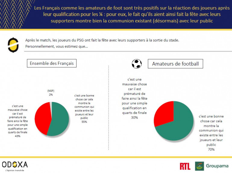Ceux qui estiment au contraire que "c'est une mauvaise chose car il est prématuré de faire ainsi la fête pour une simple qualification en quarts de finale" sont largement minoritaires, surtout parmi les Français qui connaissent et suivent le foot (30% seulement pensent cela).