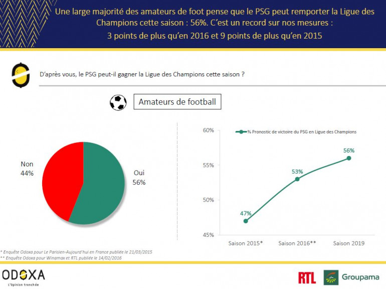 Cette qualification acquise à huis clos, avec Kylian Mbappé remplaçant au coup d'envoi, sans Marco Verratti ni Thomas Meunier, a aussi eu des conséquences spectaculaires sur les chances de victoire finale que les amateurs de foot accordent désormais au PSG. Ils sont désormais une large majorité (56%) à penser que Paris peut remporter la Ligue des Champions cette saison.