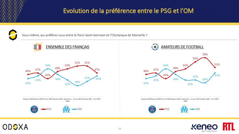 Le mouvement est le même chez les amateurs de football, qui sont 51% à préférer le PSG, un chiffre en baisse de 7 points en six mois alors que l'OM (47%) en gagne également 7.