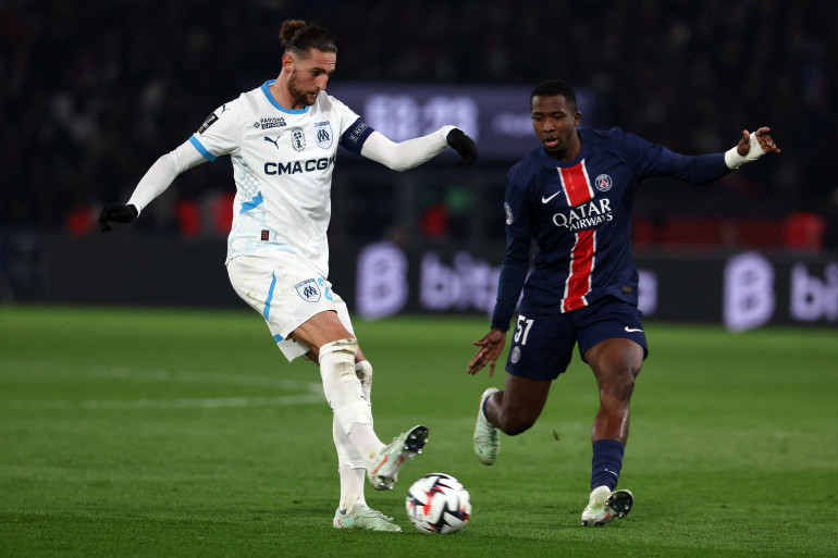 Adrien Rabiot (OM) et Willian Pacho (PSG), lors de la rencontre Paris-Saint-Germain - Olympique de Marseille, le 16 mars 2025.