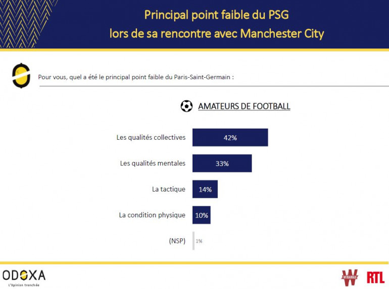33% considèrent aussi qu'il y a eu une défaillance mentale. Un jugement qui souligne à quel point la fragilité des joueurs du PSG dans certaines confrontations (matches retours face au FC Barcelone et au Bayern Munich) a marqué les esprits, sur fond de spectre de nouvelles "remontadas".