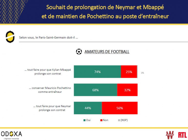 Dans ce contexte, 74% des amateurs de football pensent que le PSG doit tout faire pour prolonger Kylian Mbappé et 68% sont favorables à conserver Mauricio Pochettino comme entraîneur. 56% ne souhaitent en revanche pas que le contrat de Neymar soit prolongé. Voici les principaux enseignements du dernier sondage réalisé par Odoxa pour RTL.