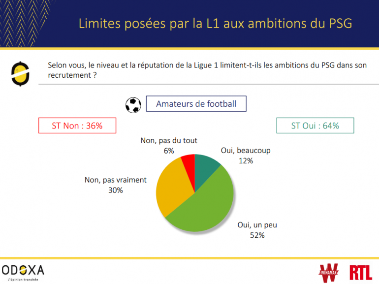 52 des amateurs de football pensent que le niveau et la réputation de la Ligue 1 limitent "un peu" les ambitions du PSG