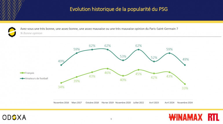 Seuls 33% des Français ont aujourd’hui une bonne opinion du PSG : la popularité du club perd 10 points en comparaison au début d’année et n’avait jamais été aussi basse depuis les débuts de notre sondage en novembre 2016 (34%).