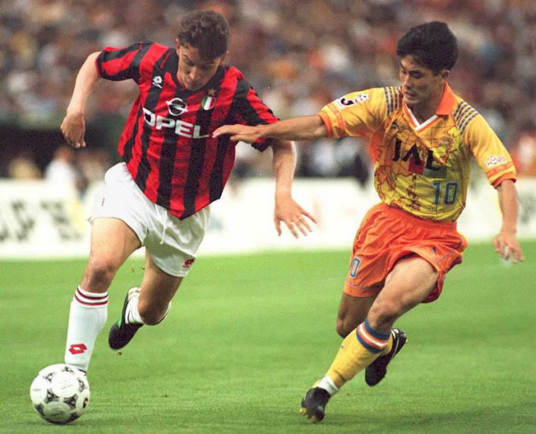 Stefano Eranio en juin 1995 avec l'AC Milan face au Japonais Hiroaki Tajima