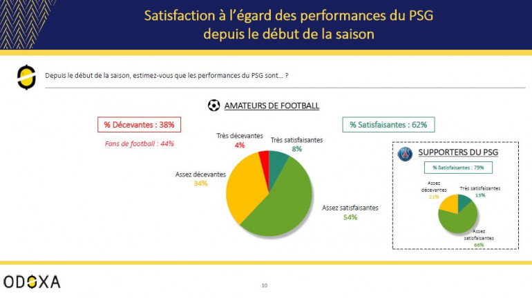 Aujourd’hui, le bilan qu’ils dressent du début de saison du PSG indique que, si le club n’a pas majoritairement déçu, ses performances ne suscitent pas d’enthousiasme non plus. 62% des amateurs de football considèrent que les performances du PSG depuis le début de saison sont satisfaisantes, ce qui reste assez limité mais, surtout, ils ne sont que 8% à les juger très satisfaisantes contre 54% qui estiment qu’elles le sont assez.