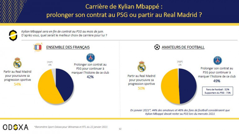 54% des Français et 50% des amateurs de football pensent d'ailleurs que l'attaquant de 23 ans devrait partir au Real Madrid à la fin de la saison pour poursuivre sa progression sportive, mais le sentiment qu’il devrait rester au PSG progresse chez les amateurs de football (49%) et il est majoritaire chez les fans (52%).