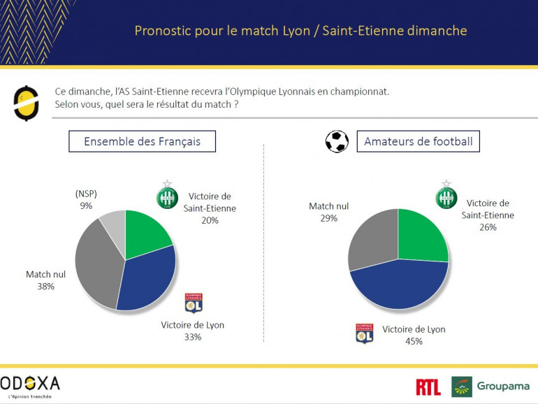 Aux yeux des Français et des amateurs de football, la balance penche là encore en faveur des Lyonnais qui joueront pourtant à l’extérieur. Les Français pronostiquent à 33% une victoire de l’OL, à 20% celle de Saint-Étienne et à 38% un match nul. Les amateurs de football optent à 45% pour un match remporté par Lyon, à 26% pour une victoire de Saint-Étienne et à 29% pour un match nul.