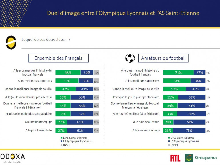 Si les verts ont plus marqué l'histoire du foot français et possèdent les meilleurs supporters aux yeux des sondés, Lyon a le meilleur président, la meilleure équipe, le plus beau stade.