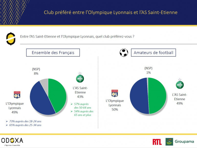 Entre l'Olympique Lyonnais et l'AS Saint-Étienne, le match de la popularité est serré mais remporté par l'OL chez les Françaises et les français, en particulier chez les moins de 34 ans.