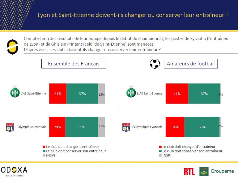 Côté Lyonnais aussi, les rumeurs vont bon train autour de Sylvinho. La victoire en Ligue des champions sur le terrain de Leipzig (2-0) devrait lui permettre de poursuivre l’aventure encore quelques temps au moins. Comme pour Ghislain Printant, les Français (59%) et les amateurs de football (63%) jugent que le club doit encore lui maintenir sa confiance.