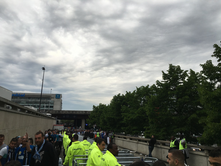 Il est environ 19h lorsque le RER D dépose une foule nombreuse sur les quais, à 2h du coup d'envoi. Dès la sortie de la gare de Saint-Denis, le personnel de la SNCF aiguille les fans ("les Marseillais à gauche, les Parisiens à droite"). Les forces de sécurité sont déjà présentes en tenue anti-émeute et à cheval. La route est quant à elle fermée à la circulation dans un quartier essentiellement d'affaires. À chaque intersection, des policiers s'assurent que la foule va dans le bon sens et une signalisation est présente, bien que peu visible pour le moment. Après une petite dizaine de minutes de marche à travers les rues où sont stationnés les bus chargés d'amener les fans de l'OM à Saint-Denis, le premier écueil intervient.